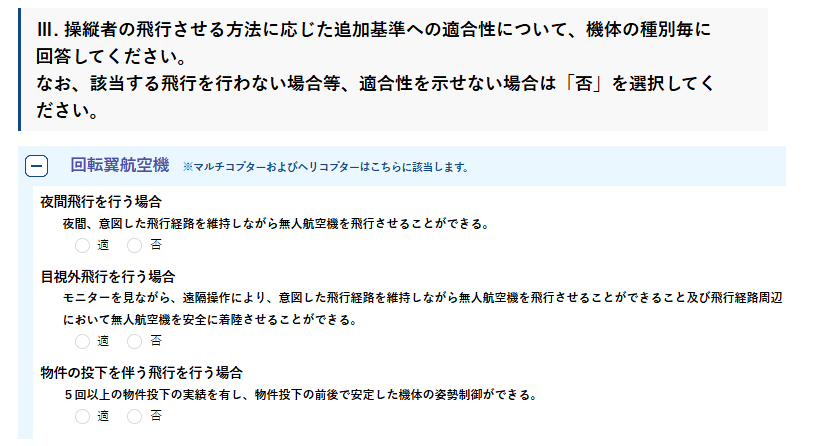 DIPS2.0で飛行許可・承認申請を行う際には、操縦者がどのような技能・資格条件を有しているかが前提となります。